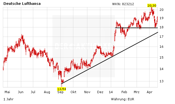 Neue Pilotenstreiks sind bei der Lufthansa derzeit nicht in Sicht. Der scheidende Lufthansa-Vorstand Christoph Franz kündigte zuletzt an, dass das Sparprogramm „Score“ noch über Jahre weitergehen soll. Investierte Anleger bleiben an Bord. Gelingt der Ausbruch über das alte Hoch bei 20,30 Euro, sollte sich der Aufwärtstrend fortsetzen.