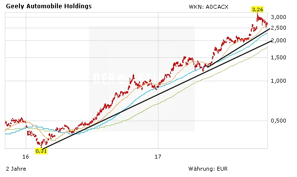 Erste ernsthafte Zweifel an einer Investition kommen meistens erst dann, wenn die Aktie den Rückwärtsgang einlegt. Und das trotz guter Absatzzahlen, trotz guter, neuer Kooperationen trotz guter Geschäftsentwicklung. So gesehen bei Geely. Sicherlich zweifelten viele Anleger zuletzt ihre Entscheidung an, in Geely investiert zu haben. Die Aktie korrigierte von 3,20 Euro bis auf knapp 2,50 Euro. Nur, dass das Papier im Vorfeld bis auf eine kurze Verschnaufpause von 2,00 Euro auf 3,20 Euro nach oben gelaufen ist, wird schnell verdrängt.