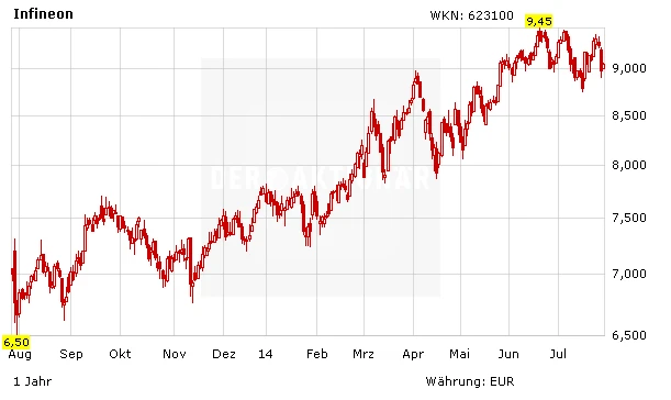 Am 30. Juli veröffentlicht Infineon die Eckdaten für das dritte Geschäftsquartal 2014. Die Optimisten gehen davon aus, dass der Chiphersteller die Erwartungen übertroffen hat und die Unternehmensziele für das Gesamtjahr sogar leicht anheben wird. Fundamental sieht es derzeit sehr gut aus. Kein Wunder: Der DAX-Konzern ist einer der größten Profiteure der starken Automobilbranche und dem Trend hin zu mehr mobilen Endgeräten.