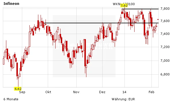 Die Zahlen kamen am Markt gut an. Im Anschluss gab es eine Reihe von positiven Analystenstimmen. Der charttechnische Ausbruch lässt aber weiter auf sich warten. Seit Monaten versucht die Infineon-Aktie bereits über den Widerstandsbereich zwischen 7,60 und 7,80 Euro zu klettern.