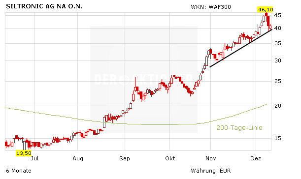 Nach wie vor hält Wacker Chemie den Großteil des TecDAX-Konzerns (rund 58 Prozent) – dies macht Siltronic als Übernahmeziel so attraktiv. Seit dem Sommer dieses Jahres profitiert der Wafer-Produzent von aufkommenden Übernahmegerüchten – rund 200 Prozent legten die Papiere daraufhin zu.