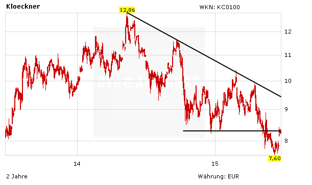 Charttechnisch bleibt die Lage bei Klöckner angespannt. Gelingt der nachhaltige Sprung über den Widerstand bei 8,30 Euro, ist der Weg bis in den Bereich von 9,50 Euro frei. Dort verläuft mit dem langfristigen Abwärtstrend allerdings noch einmal ein massiver Widerstand. In den vergangenen Monaten sind bereits mehrere Aufwärtsbewegungen an dieser Hürde abgeprallt. Zudem droht nach wie vor ein Rücksetzer in Richtung des Mehrjahrestiefs bei 7,60 Euro.