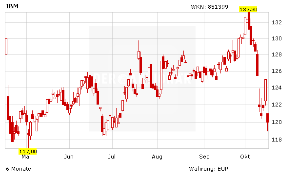 Für die Aktie von IBM ging es am Dienstagabend nach den Zahlen zum dritten Quartal deutlich herunter. Fünf Prozent verlor der Tech-Dino, nachdem eine enttäuschende Umsatzentwicklung veröffentlicht wurde.