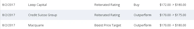 Analyst Steven Milunovich hob das Kursziel von 170 auf 180 Dollar und bekräftigte sein Votum "Buy". Dank des Wachstums in allen Bereichen vergrößere sich das "Appleversum" weiter. Er verweist auch auf den starken Ausblick und darin enthaltene Impulse des neuen iPhone 8. Ähnliche Kursziele trauen Loop Capital, die Credit Suisse und Macquarie der Apple-Aktie zu.