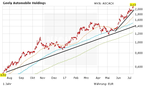 Es läuft bei Geely. Der chinesische Autobauer hatte in der vergangenen Woche sein Absatzziel für das Jahr 2017 um 10 Prozent auf 1,1 Millionen Fahrzeuge nach oben geschraubt. Begründung: deutlich höhere Verkäufe in den letzten Monaten sowie ein verbesserter Produktmix. Hinzu kommen mehrere neue Produkte im zweiten Halbjahr, die die Angebotspalette noch zusätzlich bereichern werden. Im ersten Halbjahr war der Absatz um 89 Prozent auf 530.627 Autos geklettert.
