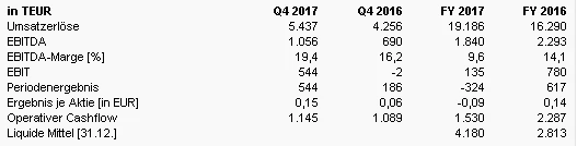 Getrieben durch die Übernahme des Konkurrenten Seracell kletterten die Erlöse im vierten Quartal um 25,6 Prozent auf 5,4 Millionen Euro, bei einer EBITDA-Marge von 19,4 Prozent, im Gesamtjahr 9,6 Prozent.
