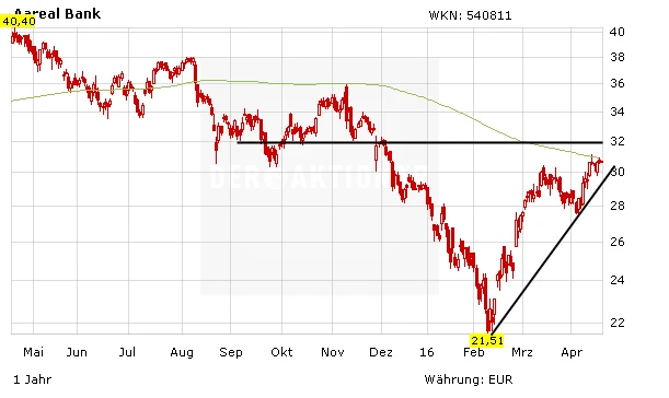 Auch die Charttechnik spricht derzeit klar für steigende Kurse bei der Aareal Bank. Die Aktie ist kurz davor, die bedeutende 200-Tage-Linie zu überwinden. Gelingt dies, rückt schnell der Widerstand bei 32 Euro in den Fokus. Wird er ebenfalls überwunden, sollte es schnell in Richtung 36 Euro gehen.