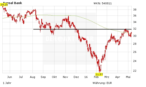 Unter dem Strich wuchs der Überschuss um mehr als 40 Prozent auf 51 Millionen Euro. Trotz des starken Jahresbeginns hielt der Vorstand an der vorsichtigen Prognose für das Gesamtjahr fest. Demnach soll das Betriebsergebnis weiter zwischen 300 und 330 Millionen Euro landen. Auch bei der Risikovorsorge änderte der Vorstand seinen Ausblick nach dem entspannten ersten Quartal nicht und erwartet weiter Belastungen von 80 bis 120 Millionen Euro.