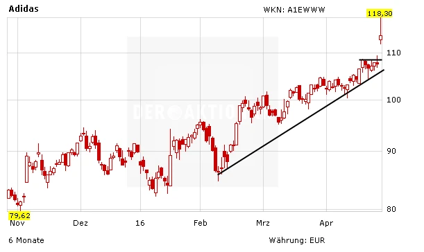 Das höchste Kursziel aller 43 Experten, die die Aktie covern, hat Jamie Bajwa von der US-Investmentbank Goldman Sachs. Bajwa hat den fairen Wert von 117,50 auf 135,80 Euro angehoben und die Einstufung auf "Buy" belassen. Der Sportartikelkonzern habe laut dem Analysten eine stark positive Geschäftsdynamik verzeichnet. Der Experte erhöhte seine Gewinnprognosen (Ebit) für die Jahre 2016 bis 2018 um durchschnittlich sieben Prozent.
