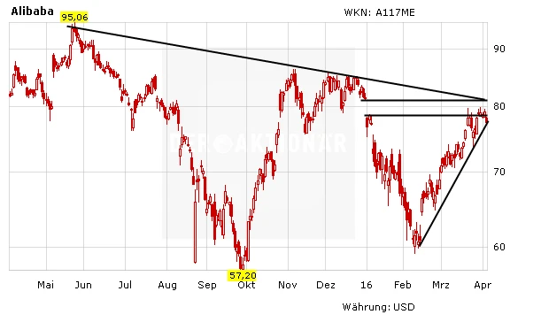 Eine wahrlich starke Entwicklung legte die Alibaba-Aktie in den vergangenen Wochen hin. Seit dem Jahres-Tief bei 59,25 Dollar am 9. Februar gewann das Papier mehr als 30 Prozent an Wert. Sollten investierte Anleger nun ihre Gewinne einstreichen, zumal der Wert am heutigen Handelstag bislang Federn lassen muss?