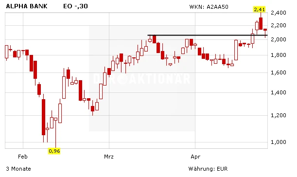 Das Sentiment für Bank-Aktien hat sich deutlich gebessert. Stark ausgebombte Titel wie die griechische Alpha Bank sind wieder gefragt. Vor wenigen Tagen lieferte die Aktie mit dem Ausbruch über den Widerstand bei 2,06 Euro ein Kaufsignal. In den kommenden Tagen wird sich zeigen, ob es nachhaltig ist.
