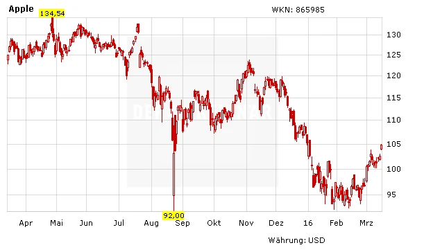 Die Apple-Aktie kann am Dienstag mehr als zwei Prozent zulegen. Zwar notiert das Papier damit nach wie vor deutlich unterhalb der wichtigen 200-Tage-Linie, ausgehende vom jüngst ausgebildeten doppelten Boden sieht DER AKTIONÄR aber kurzfristiges Rebound-Potenzial. Trader greifen zu!