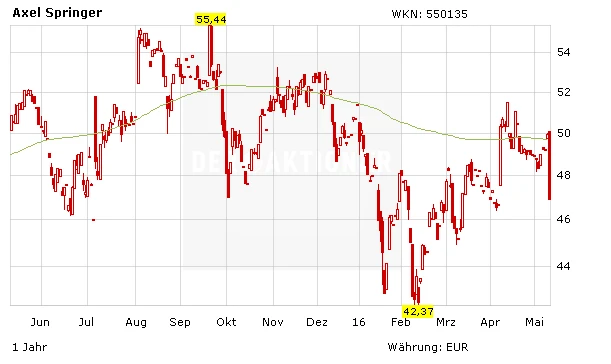Die Aktie des Medienkonzerns Axel Springer ist am Mittwoch nach Vorlage der Quartalszahlen deutlich eingebrochen und zeitweise an das MDAX-Ende gerutscht. Während der Gewinn zu Jahresbeginn gestiegen ist, liegt das Umsatzplus unter den Erwartungen.