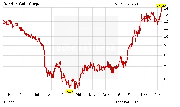 Natürlich hängt die Entwicklung von Barrick Gold maßgeblich an der Entwicklung des Goldpreises. Dennoch: Die Aktien entwickeln erstmals seit Jahren wieder eine relative Stärke zu Gold. In den vergangenen Wochen haben Rücksetzer stets eine Kaufgelegenheit dargestellt. Investierte Anleger bleiben an Bord. Mutige nutzen den Rücksetzer zum Ausbau der Position.