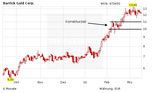 Wichtige Unterstützungsmarken sind 1.180 und 1.150 Dollar. Auch Barrick Gold dürfte in diesem Umfeld tendenziell unter Druck geraten. Der Chart deutet auf eine Top-Bildung hin. Blickt man auf den Chart in Euro ist ein Kursrutsch bis in den Bereich von 10,00 Euro möglich – eine Korrektur von etwas mehr als 20 Prozent. Das klingt auf den ersten Blick enorm. Bedenkt man allerdings, dass die Aktie Mitte Januar noch bei 7,40 Euro stand, relativiert sich ein solcher Rücksetzer. Anleger sollten angesichts der Gemengelage durchaus einige Gewinne mitnehmen. Es spricht nichts dagegen, die Aktie später wieder zurückzukaufen, wenn sich die Turbulenzen gelegt haben.
