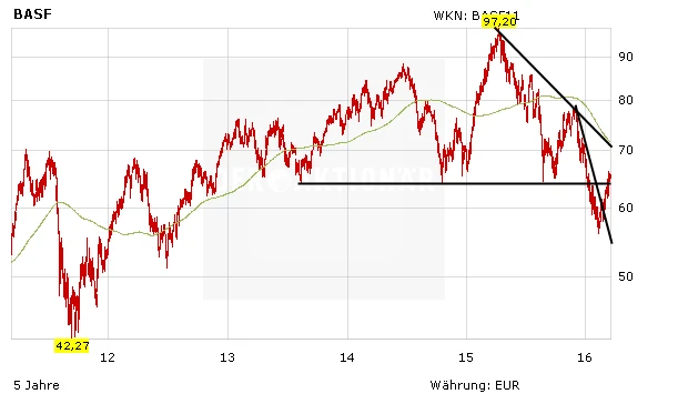 Das Marktumfeld ist für BASF derzeit wahrlich nicht einfach und könnte noch längere Zeit herausfordernd bleiben. Allerdings sollte dies angesichts der schwachen Aktienkursentwicklung der vergangenen Monate und der aktuell günstigen Bewertung bereits eingepreist sein. Tradingorientierte Anleger können wegen des mittlerweile wieder positiven Chartbildes wieder einen Fuß in die Tür stellen (Stopp: 55,50 Euro).