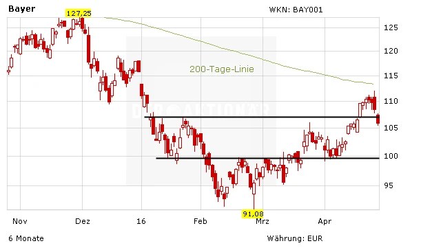 Die Aktie von Bayer hat den Korrekturkurs eingeschlagen. Mehr als 2,5 Prozent verliert das Papier auf 105,70 Euro. Das Unternehmen hatte am Dienstag die Zahlen für das erste Quartal gemeldet. Seitdem setzten Gewinnmitnahmen ein. Zudem dürften auch einige Analystenkommentare belastet haben.