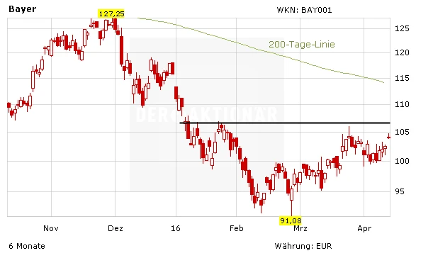 Die Aktie von Bayer hat ihre kurze Konsolidierungsphase wieder abgeschlossen und kann zur Wochenmitte weitere Kursgewinne verbuchen. Am Mittwochvormittag legt die Aktie 1,4 Prozent auf 104,00 Euro zu. Der Wert profitiert dabei unter anderem von einem positiven Analystenkommentar. Die Deutsche Bank hat die Einstufung für Bayer vor den Zahlen auf "Buy" mit einem Kursziel von 140 Euro belassen. Der Pharma- und Chemiekonzern sollte über ein erstes Quartal mit moderaten Zuwächsen berichten, schrieb Analyst Tim Race in einer Studie vom Dienstag. Der Fokus der Anleger dürfte auf dem Umbau des DAX-Konzerns liegen, etwa den Plänen für die restlichen Anteile an der Kunststofftochter Covestro.