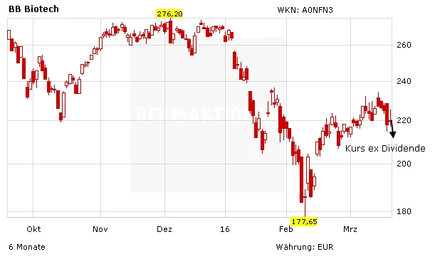 Die Aktie von BB Biotech notiert am Morgen kräftig im Minus. Mehr als vier Prozent verliert das Papier auf 214,42 Euro. Dabei hatte der Nasdaq Biotech Index doch am Freitag 1,8 Prozent zugelegt. BB Biotech investiert zum größten Teil in US-Biotechs. Doch Grund zur Sorge gibt es keine. Der heutige Abschlag ist allein der Dividendenzahlung in der laufenden Woche geschuldet. Die Aktie von BB Biotech notiert seit heute ex der Dividende in Höhe von 14,50 Schweizer Franken.