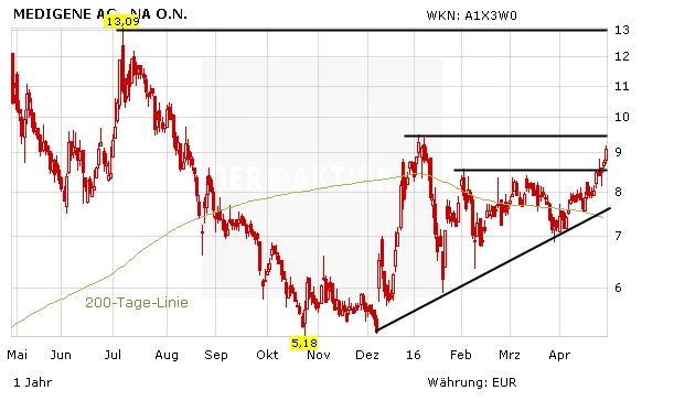 Anleger mussten bei der Aktie von Medigene, größte Position im Musterdepot des Biotech-Reports (www.biotechreport.de), zuletzt viel Geduld mitbringen. Lange Zeit tendierte das Papier seitwärts und schien, die Marke von acht Euro einfach nicht nach oben durchbrechen zu können. Doch nun scheint der Knoten geplatzt zu sein. Vor Kurzem bereits hat der Wert die 200-Tage-Linie noch einmal erfolgreich getestet und von da aus ging es geradewegs nach oben. Die 8-Euro-Marke wurde genauso überwunden wie die wichtige Hürde bei 8,50 Euro. Nun steuert das Papier in Richtung des Jahreshochs bei 9,49 Euro. Kann auch dieses geknackt werden, ist der Weg bis vorerst jenseits der 12-Euro-Marke frei