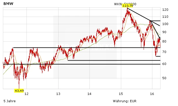Maßgebliche Aufwärtstrends gibt es im Chartbild der BMW-Stammaktie nicht mehr. Dafür geht es seit dem Rekordhoch im März 2015 und seit dem Hoch von Dezember 2015 bergab. Mitte Januar kam ein kräftiges Verkaufssignal, als die 38-Tage-Linie die 200-Tage-Linie von oben nach unten durchschnitt. Jüngst schaltete auch der Indikator MACD auf Verkaufen um und die steigende 38-Tage-Linie bei derzeit 77,25 Euro ist nun auch unterschritten worden. Wenn es in einem freundlichen Börsenumfeld wieder aufwärts gehen würde, wären die nächsten Hürden eben die 38-Tage-Linie, die seit Dezember 2015 gültige Abwärtstrendlinie bei momentan 81,90 Euro, das Hoch von März 2016 bei 83,90 Euro und schließlich die sinkende 200-Tage-Linie bei aktuell 86,90 Euro als hohe Hürde. Anschließend folgten die seit März 2015 intakte Abwärtstrendlinie bei momentan 97,15 Euro, das Hoch von Dezember 2015 bei 104,85 Euro und das Rekordhoch von März 2015 bei 123,75 Euro.