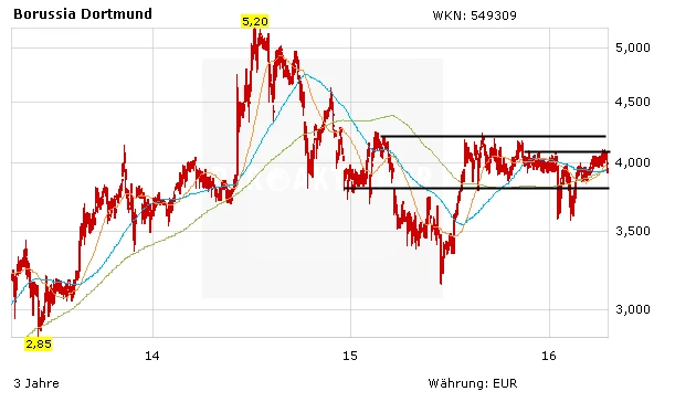 Es bleibt dabei: Der BVB spielt eine erstklassige Saison. Nach dem Ausscheiden aus der Europa League ist die Aktie zwischenzeitlich unter Druck geraten. Potenzial ergibt sich erst wieder, wenn die Widerstandszone zwischen 4,10 Euro und 4,20 Euro überwunden wird. Die Aktie ist nicht nur für Fußball-Liebhaber eine interessante Depotbeimischung. Kursziel 5,00 Euro.