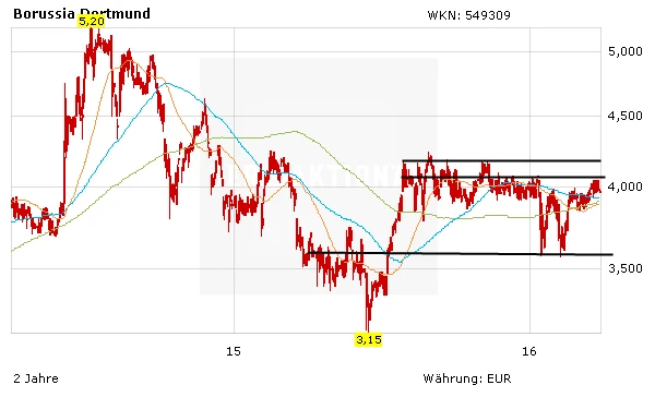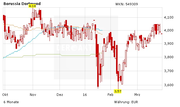 Sei’s drum: Aubameyangs derzeitiger Marktwert wird auf transfermarkt.de auf knapp 45 Millionen Euro geschätzt. Der BVB kann derzeit sicherlich weitaus mehr erzielen. Die Aktie sieht seit wenigen Tagen auch technisch wieder besser aus und honoriert den sportlichen Erfolg des BVB. Jetzt gilt es, die Widerstandszone zwischen 4,10 Euro und 4,20 Euro zu überwinden. Die Aktie ist nicht nur für Fußball-Liebhaber eine interessante Depotbeimischung. Kursziel 5,00 Euro.