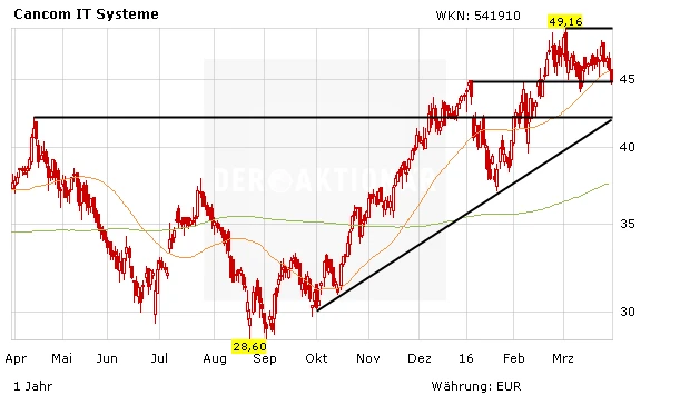 Chartbild und Anlegerstimmung sprechen derzeit gegen die Aktie von Cancom. Allerdings hat der Vorstand das Unternehmen bislang sehr gut geführt. Fundamental bleiben die Aussichten ebenso gut. Entsprechend bleibt DER AKTIONÄR zuversichtlich und rät weiter zum Kauf der Aktie. Das Kursziel beträgt 55 Euro und der Stop-Loss sollte bei 41 Euro gesetzt werden.