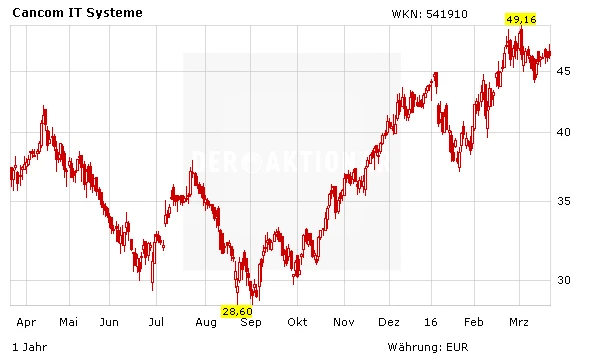 Cancom ist nach dem holprigen ersten Halbjahr 2015 zum Jahresende wieder erfolgreich auf Wachstumspfad zurückgekehrt. Derzeit raten alle sechs Analysten, die sich mit dem TecDAX-Konzern beschäftigen, zum Kauf der Aktie. Dabei beträgt das durchschnittliche Kursziel 51,60 Euro. Die Experten schätzen den Gewinn je Aktie für das vergangene Jahr auf 1,91 Euro. Trotz der Verwässerung durch die Kapitalerhöhung soll dieser Betrag in diesem Jahr um mehr als 25 Prozent auf 2,40 Euro steigen. Daraus resultiert ein 2016er-KGV von 19.