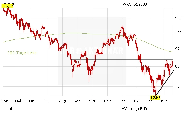 In den vergangenen Tagen pendelte die BMW-Aktie knapp oberhalb der 80-Euro-Marke. Der kurzfristige Aufwärtstrend seit dem 52-Wochen-Tief im Februar ist allerdings nach wie vor intakt. Neues Potenzial würde sich beim Autobauer auftun, wenn der horizontale Widerstand bei 83,50 Euro überwunden wird. Dann rückt die 200-Tage-Linie bei 87,30 Euro wieder in den Fokus.