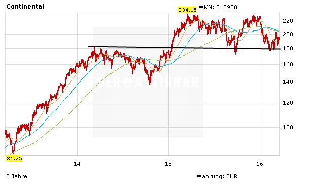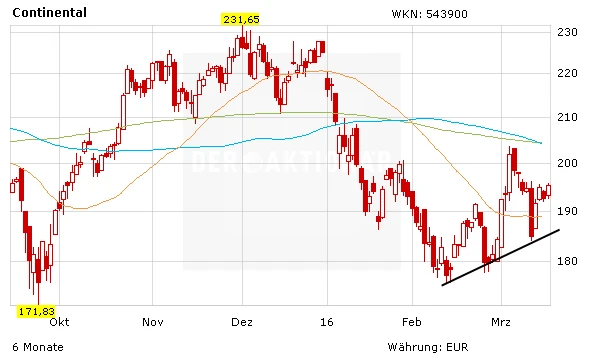 Die Aktie sieht auch technisch gut aus. Das Papier hat bei 180 Euro eine Unterstützung gefunden. Seitdem klettert die Aktie langsam aber sicher wieder nach oben. Nächster Zwischenstopp ist die Marke von 205 Euro. Hier verlaufen derzeit sowohl die 90-, als auch die 200-Tage-Linie. Werden diese überwunden, eröffnet sich der Conti-Aktie neues Potenzial. Kaufen!