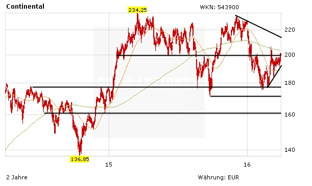 Charttechnisch hat die Notierung die seit Januar 2015 bestehende Marke von 200 Euro überwunden. Der Indikator MACD hat Mitte Februar ein Kaufsignal erzeugt und so dürfte bald die sinkende 200-Tage-Linie bei momentan 203,70 Euro überwunden werden. Das wiederum würde ein neues, starkes Kaufsignal bedeuten. Die nächsten Hürden sind die seit dem Rekordhoch von Dezember 2015 gültige Abwärtstrendlinie bei derzeit 215,70 Euro und eben dieses Hoch bei 231,90 Euro.