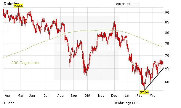 Die Erholung der Daimler-Aktie dürfte weiter gehen. Bleibt das Marktumfeld freundlich, sollte die 70-Euro-Marke als nächstes Etappenziel ins Visier geraten. Hier verläuft derzeit die 90-Tage-Linie. In der Autobranche bleibt Daimler damit der Favorit. Für spekulative Anleger ist auch Peugeot weiterhin eine gute Wahl.