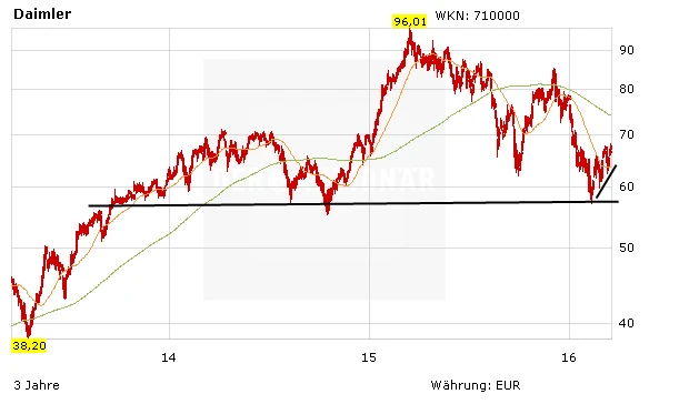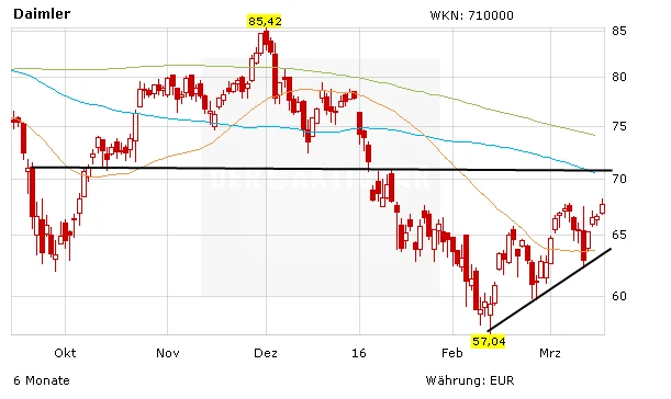 Dennoch: Die Daimler-Aktie hangelt sich in einem intakten kurzfristigen Aufwärtstrend langsam wieder nach oben. Wer investiert ist, lässt die Gewinne laufen. Daimler bleibt der Favorit im Autosektor. Nächstes Ziel ist die Marke von 70 Euro. Hier verläuft die 90-Tage-Linie. Diese gilt es nach oben zu knacken. Dann eröffnet sich neues Kurspotential.