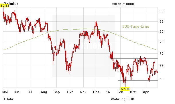 Bei der Daimler-Aktie bleibt es spannend. Die Unterstützungszone zwischen 58 und 60 Euro, die sich in der Vergangenheit etabliert hat, muss erneut halten. Auf dem aktuellen Niveau ergibt sich für Anleger nun eine Kauf- beziehungsweise Nachkaufchance. Allerdings sollte ein enger Stopp bei 57,50 Euro die Position vor neuen Attacken aus den USA absichern.