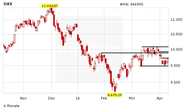 Sollte der Dax diese Hürden meistern, hätte er kurzfristig Luft bis 9.905 Punkte, den Hochpunkten von Ende Januar und Anfang März. Überwindet er auch diesen Widerstand, wäre ein weiteres Gap bei 9.947 Zählern zu schließen. Ein Befreiungsschlag wäre der Sprung über das jüngste Verlaufshoch bei 10.112 Punkten.
