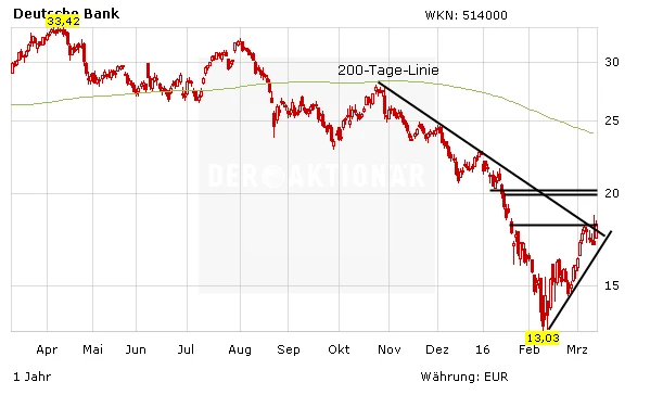Was für eine Woche: Wie auf der Achterbahn ging es für die Aktie der Deutschen Bank rauf und runter. Was bleibt? Die charttechnische Situation hat sich weiter verbessert. Die Chancen auf steigende Kurse stehen gut.