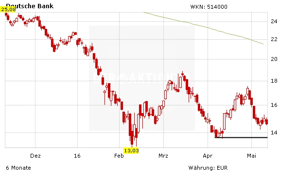 Die Aktie der Deutschen Bank steht am Mittwoch unter Druck. Der Titel rutscht unter die wichtige 15-Euro-Marke. Droht jetzt das Abrutschen bis auf das Tief bei 13 Euro?