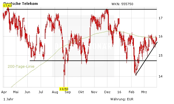 Es ist ein Bild, das man zuletzt öfter gesehen hat: An der 200-Tage-Linie ist die Aktie der Deutschen Telekom erneut nach unten gedreht. Der DAX-Titel hat die wichtige 16-Euro-Marke damit noch immer nicht überwunden. Gleichzeitig ist der kurzfristige Aufwärtstrend aber nach wie vor intakt.