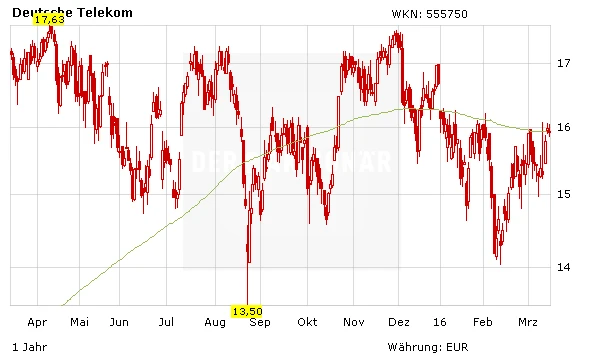 Im schwachen DAX kann sich die T-Aktie am Dienstag recht stabil im Bereich der 16-Euro-Marke halten. In dieser Region verläuft aktuell auch die 200-Tage-Linie. Gelingt ein nachhaltiger Ausbruch, richtet sich der Blick auf die obere Begrenzung des gegenwärtigen Seitwärtstrends bei 17,50 Euro. Neben den positiven Geschäftsaussichten bei der Digitalisierung spricht auch die attraktive Dividendenrendite von 3,4 Prozent für das Papier.