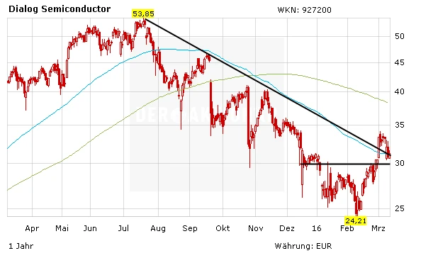 Die Fachleute von Börse Online sind von der Geschäftsentwicklung der Dialog Semiconductor plc enttäuscht. Das liegt an der Schwäche des Hauptkunden, dem US-Technologiekonzern Apple. Allgemein nähere sich die Wachstumsphase im weltweiten Smartphone-Markt dem Ende. Die Wirtschaftsabkühlung in der Volksrepublik China und die Währungsabwertung in Schwellenländern bremsen den Verkauf dieser Telefone zusätzlich. Der auf die Entwicklung von Strom sparenden Computerchips für mobile Telekom-Endgeräte spezialisierte Konzern hatte bereits im vierten Quartal 2015 weniger umgesetzt und weniger verdient als ein Jahr zuvor. Nun sagte Vorstandsvorsitzender Dr. Jalal Bagherli, es sei auch zu Beginn dieses Jahres mit weiteren Einbußen zu rechnen. Im ersten Quartal 2016 soll der Umsatz im Jahresvergleich um 21 bis 26 Prozent auf 245 bis 230 Millionen Euro sinken. Allerdings soll der Erlös im Gesamtjahr um einen einstelligen Prozentbetrag steigen. Dazu soll auch das für September erwartete neue iPhone-Modell von Apple sorgen. Risikobereite Anleger sollten die Aktie von Dialog auch deshalb weiterhin kaufen, weil sie mit einem KGV von 13 für dieses Jahr günstig bewertet ist. Das Kursziel beträgt 40 Euro und der Stop-Loss sollte bei 22,40 Euro gesetzt werden.
