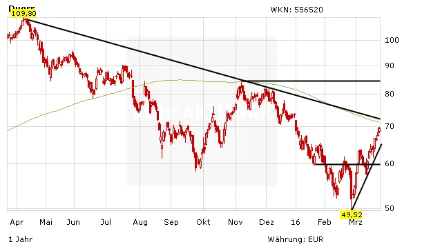 Nachdem der Chart und der MACD noch immer zum Kauf einladen sowie die Analysten nun zuversichtlicher werden, bleibt DER AKTIONÄR dabei: Bislang haben die Anleger wohl zu stark am künftigen Geschäftserfolg der Dürr AG gezweifelt. Langfristig ausgerichtete Investoren sollten deshalb einsteigen und ihr Engagement bei 45 Euro absichern.