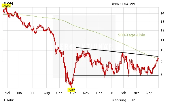 Die Diskussion um die Lagerung des Atommülls, die Abspaltung der Tochter Uniper oder niedrige Strompreise: E.on hat nach wie vor mit zahlreichen Unwägbarkeiten zu kämpfen. Konservative Anleger bleiben deshalb an der Seitenlinie. Trader können das gute Chartbild hingegen nutzen und darauf setzen, dass die Erholung zunächst bis 10,00 Euro weitergeht. Ein enger Stopp bei 8,60 Euro sichert ab.