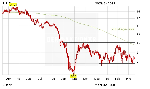 Seit dem Rekordtief im September vergangenen Jahres pendelt die E.on-Aktie seitwärts. Im Bereich zwischen 8,00 und 9,00 Euro hat sich der DAX-Titel zuletzt stabilisiert. Am Donnerstag zählen die Papiere des Versorgers im schwachen Marktumfeld zu den stärkeren Werten im DAX.