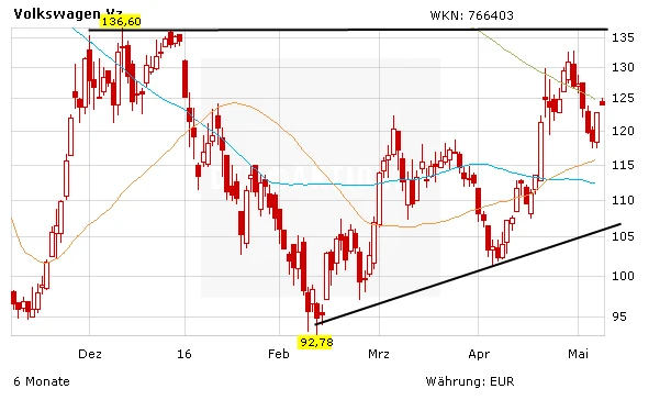 Charttechnisch sieht die VW-Aktie in den letzten Tagen wieder besser aus. Der Widerstandsbereich zwischen 120 und 122 Euro wurde zurückerobert. Die Aktie ist kurz davor, die 200-Tage-Linie zu überwinden. Wird diese nachhaltig geknackt, wäre dies ein neues Kaufsignal.