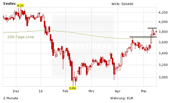 Das Düsseldorfer Bankhaus Lampe hat die Einstufung für Evotec auf "Kaufen" ebenfalls bestätigt und zuletzt das Kursziel sogar von 4,40 auf 4,60 Euro angehoben. Das erste Quartal des Biotech-Unternehmens sei außerordentlich stark gewesen, schrieb Analyst Volker Braun in einer Studie vom Dienstag. Die Jahresziele seien gut erreichbar und könnten eventuell noch aufgestockt werden.