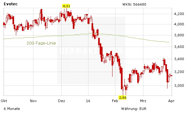 Die Aktie von Evotec hat seit ihrem Tief im Februar bei 2,86 Euro zuletzt deutlich aufholen können, ist aber vorerst am Widerstand bei 3,50 Euro gescheitert. Nach einem Rücksetzer bis in den Bereich von knapp drei Euro könnte der Wert schon bald erneut Anlauf auf diese Hürde zu nehmen. Davon sind auch die Experten vom Analystenhaus Montega überzeugt. Sie Empfehlen die Aktie von Evotec mit einem Kursziel von 4,20 Euro zum Kauf. „Trotz eines Rückgangs bei den Meilensteinzahlungen konnte Evotec dank der Allianz mit Sanofi starke Umsatz- und Ergebniszahlen für das abgelaufene Geschäftsjahr vorlegen. Q4 erwies sich dabei als das stärkste Quartal des Jahres“, kommentierte Analyst Dr. Stefan Schröder das jüngste Quartalsergebnis der Gesellschaft.