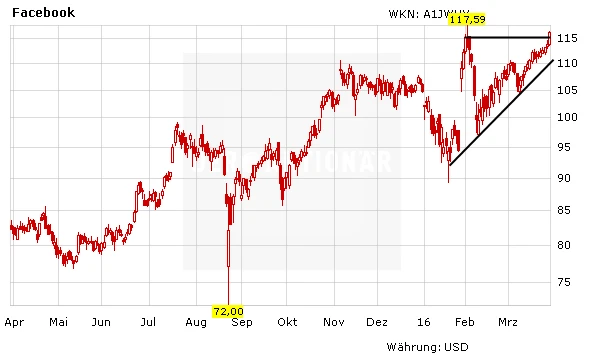 Mit 599 Dollar liegt die Brille auf dem Preisniveau von Smartphones. Experten sprechen unlängst vom Next Big Thing. Der große Wurf aus charttechnischer Sicht, nämlich der Ausbruch aus einem steigenden Dreieck, gelang dem Papier in den vergangenen Handelstagen. Der Widerstand von 115,72 Dollar wurde aus dem Weg geräumt. Das Allzeithoch von 117,59 Dollar dürfte der Nasdaq-Titel in den kommenden Tagen anlaufen. Wird auch dieses herausgenommen, liegt damit das stärkste Kaufsignal überhaupt, ein neues Allzeithoch, vor.
