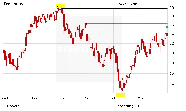 Der langfristige Aufwärtstrend bei Fresenius ist intakt. Seit den Tiefstständen im Februar konnte sich die DAX-Aktie wieder erholen. Dabei wurde der seit Anfang Dezember gültige mittelfristige Abwärtstrend durchbrochen. Seit Anfang März konsolidiert der Kurs diese Bewegung im Bereich zwischen 59 Euro und 64 Euro. Mit dem nachhaltigen Sprung über die 64-Euro-Marke würde ein neues Kaufsignal generiert. Die nächsten Ziele liegen dann bei 66 und 70 Euro.