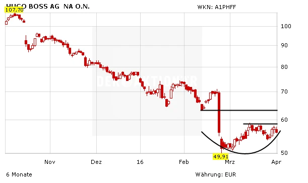 Die Aktie von Hugo Boss ist dabei ihre Bodenbildung abzuschließen. Damit diese unter Charttechnikern als abgeschlossen gilt, muss das Papier noch zwei Widerstände aus dem Weg räumen. Allerding sieht fast genau an einer dieser wichtigen Marken ein Analyst den MDAX-Titel als fair bewertet an.
